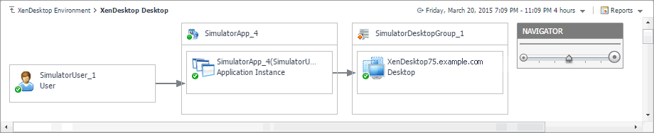 The Dependency tab helps you understand the dependencies between the XenDesktop components associated with the selected session. The dependency map displays the relationships between the XenDesktop user, Desktop, virtual machine, datastore, and physical host. For complete information about dependency maps, see Viewing object dependencies .