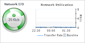 The Network I/O spinner indicates the rate at which the selected ESX host currently reads data from and writes to the network. The Transfer Rate line in the Network Utilization chart represents the rate at which the selected virtual center transfers data from and to the network during the selected time period. The Baseline area in the chart indicates the expected network utilization range based on historical data.