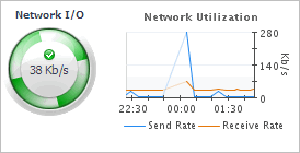 The Network I/O spinner indicates the rate at which the selected virtual center currently reads data from and writes to the network. The Receive Rate line in the Network Utilization chart represents the rate at which the selected virtual center reads data from the network during the selected time period. Send Rate displays the rate at which the selected virtual center sends data to the network.