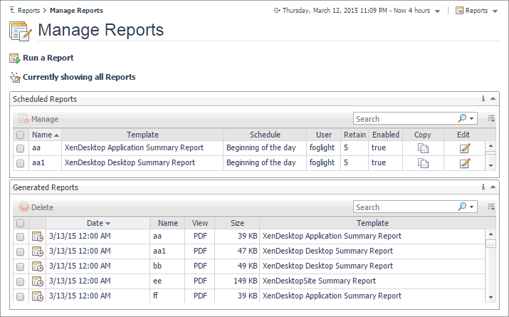 Foglight for Citrix XenDesktop and XenApp includes a report generation ability. This allows you to create reports using a set of predefined templates to report on the various aspects of your virtual environment. Foglight for Citrix XenDesktop and XenApp includes a collection of predefined report templates.