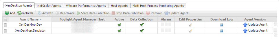 XenDesktop Agents and NetScaler Agents tabs: These tabs list the existing instances of the XenDesktop and NetScaler type, and allow you to manage them. These agents are provided with Foglight for Citrix XenDesktop and XenApp. For more information, see Managing XenDesktop and NetScaler Agent instances.