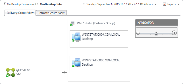 Infrastructure View: This tab illustrates the relationships between main infrastructure elements components associated with the Delivery Groups that belong to the selected XenDesktop site, such as the NetScaler Gateway, StoreFront Server, Delivery Controller, Domain Controller Database, and the License Server. |