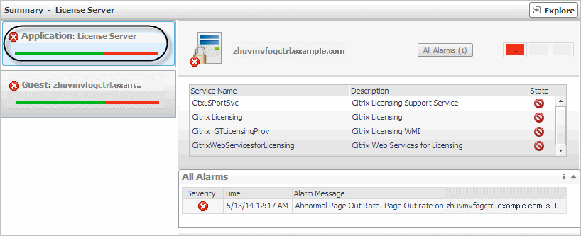 When the Application tile on left is selected this view shows the list of services running on the selected License Server or Delivery Controller, and displays any alarms associated with it. |