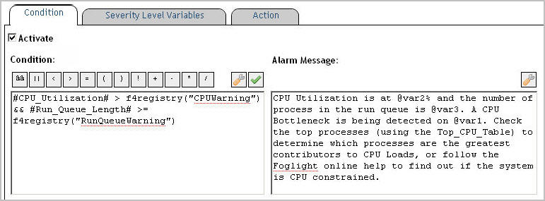 Enabled: Indicates if a rule is enabled or disabled. When a rule is disabled, its conditions are not being evaluated which prevents the rule alarms from being generated. For example, if Foglight is collecting any data that, under normal circumstances, result in alarm generation. Failing to generate alarms can be an indication that the rule is disabled. Rules are often brought offline during system maintenance periods.