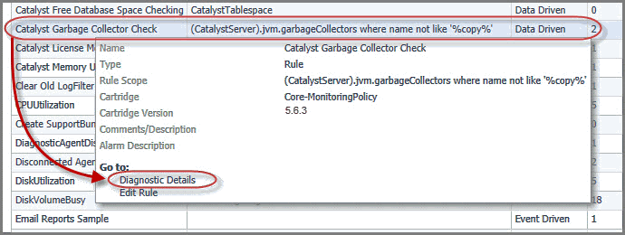 The Diagnostic Details view contains detailed run-time information about a selected rule. Use this view to determine which objects are evaluated by the rule and as a debugging tool to help you understand any rule-related problems. Drill down to this view from the Rule Diagnostics dashboard.