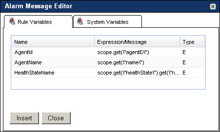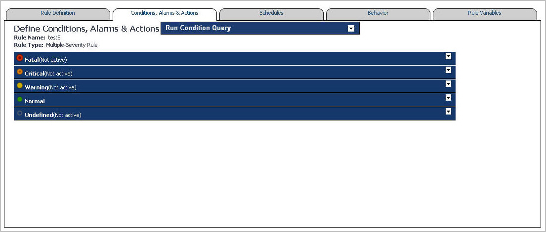 Alarms: Contains the number of alarms (multiple-severity rules only) generated by the rule. Clicking that column shows a list of alarms indicating for each alarm its severity, when the alarm was generated, and the alarm message.