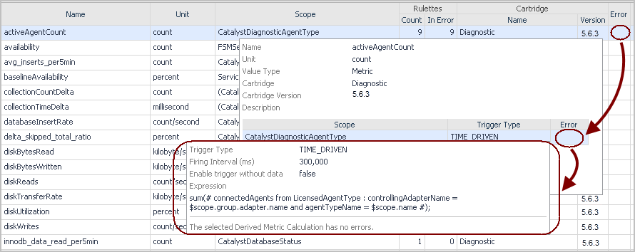 If a derived metric instance has any errors associated with it, the Error column contains the error indicator. Drill down on an error indicator. Displays a message that can help you diagnose the problem.