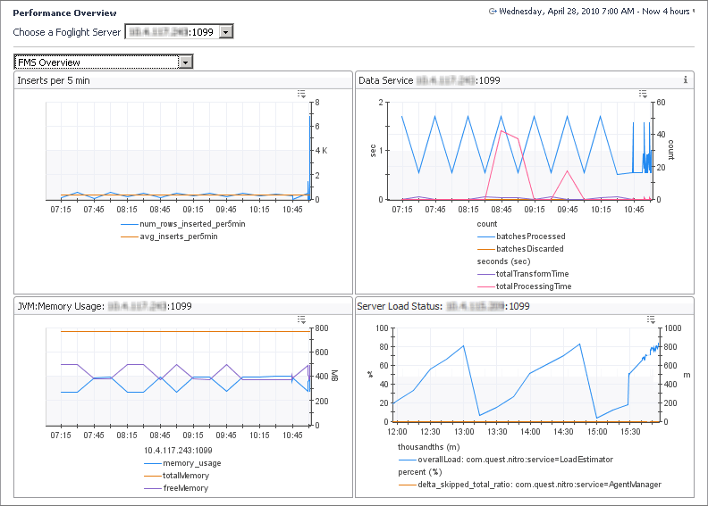 The Performance dashboard contains at-a-glance view of Foglight diagnostics. It shows the rate of database inserts, data processing activity, JVM memory usage, server load, and other combinations of views. Certain types of metric patterns displayed on this dashboard can be useful in troubleshooting specific performance problems. For example, a sudden increase in free memory utilization is a good indicator that the amount of incoming data exceeds typical thresholds. To access this dashboard, from the navigation panel, click Dashboards > Management Server > Diagnostic > Performance.