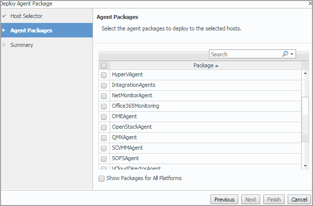 In the Deploy Agent Package wizard, on the Agent Packages page, select the HyperVAgent, SCVMMAgent,and SOFSAgent packages, and then click Next.