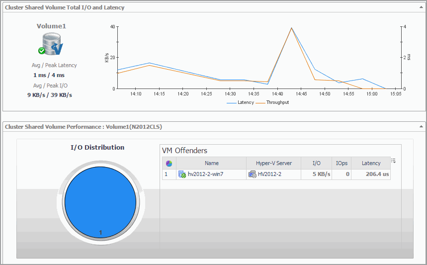 The Volume view shows the data transfer rates and latency detected for the selected volume. It also identifies the virtual machines that use the highest amounts of the volume resources.The information provided on this tab can help you prevent potential bottlenecks by reallocating disk resources where they are most needed.