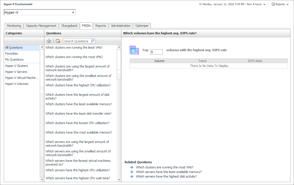 The Hyper-V Environment dashboard contains the FAQts tab that you can use to ask questions about your monitored systems and review the answers. In the Categories pane, the FAQts view shows several question categories. Clicking a category shows the questions belonging to that category in the Questions pane. From there, clicking a question shows the answer on the right.