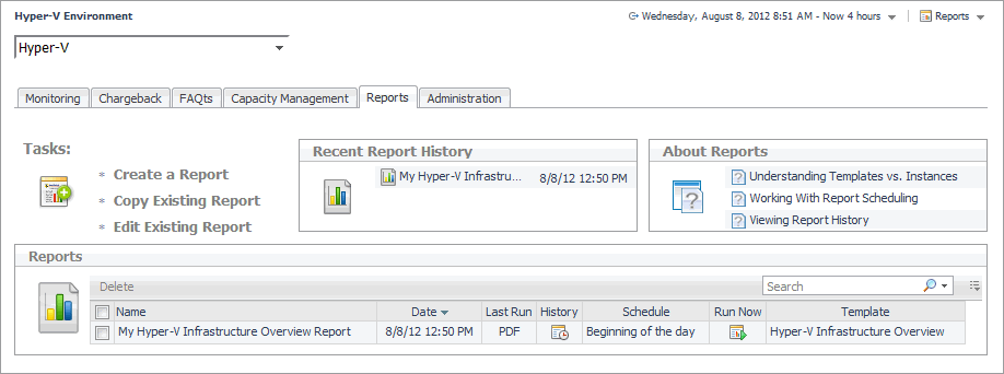 You can generate, copy, and edit reports using the Reports tab on the Hyper-V Environment dashboard, or alternatively the Reports dashboard included with the Management Server.