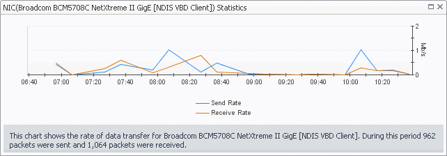 Network Summary, Send. The current rate at which a network interface card transfers data to the network.
