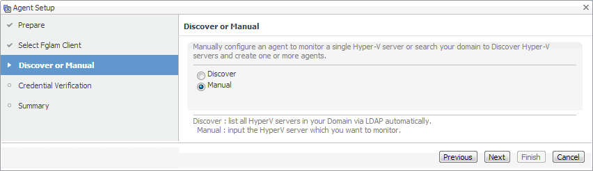 Hyper-V Agents only. On the Discover or Manual page that appears, you can indicate if you want to manually specify the Hyper-V Server that you want to monitor, or to choose between the servers running in a given domain. |