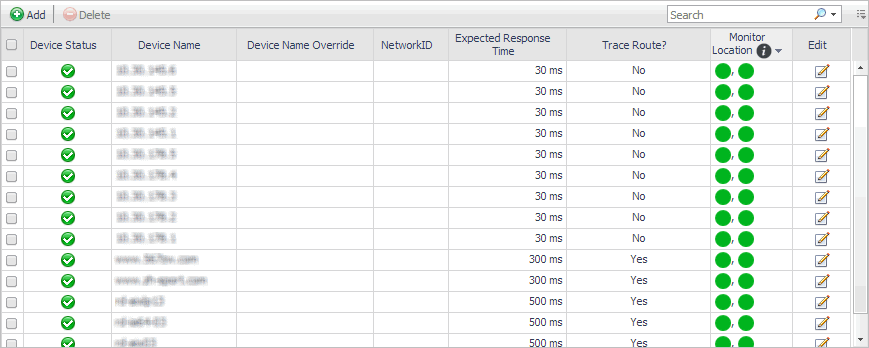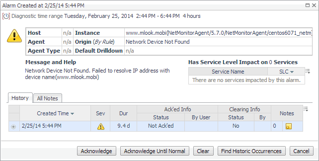 Lists the alarms generated against the monitored locations. NOTE: To acknowledge or clear one or more alarms appearing in this table, select them and click Acknowledge or Clear, as required. For more information about alarms in Foglight, see the Foglight User Guide. | |||||||||||