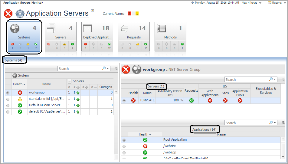 The Systems tile provides a high-level overview of the behavior of your systems. Use this view to review groups of monitored domains, cells, cluster topologies, and partitions. From here you can quickly see the number of servers and deployed applications being monitored, their health, availability, and more.