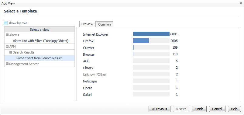 On the Select a Template screen, deselect show by role, and then expand APM > Search Results. Select the map or chart to display.