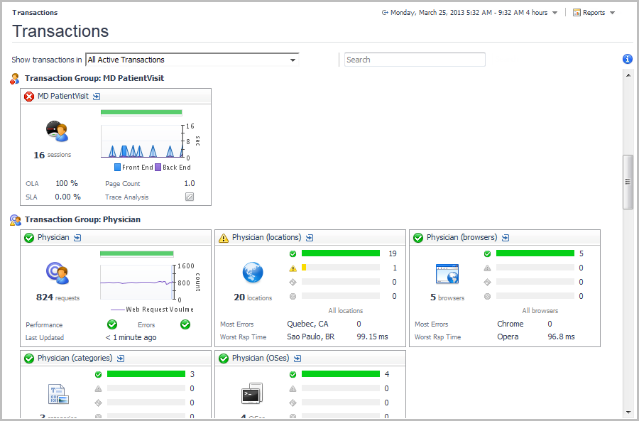 Locate a transaction group that is experiencing errors. For example, users in the Physician transaction group are experiencing poor performance. The health status icon indicates Warning status . The transaction has not yet experienced a complete failure, but some component needs attention.