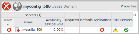 The Servers table lists all the application servers running in your environment. Use this table to review the health and version of any monitored application server, as well as the availability (up time as a percentage), and any outages. Select an application server in this table to display detailed information in the Server Details view on the right.