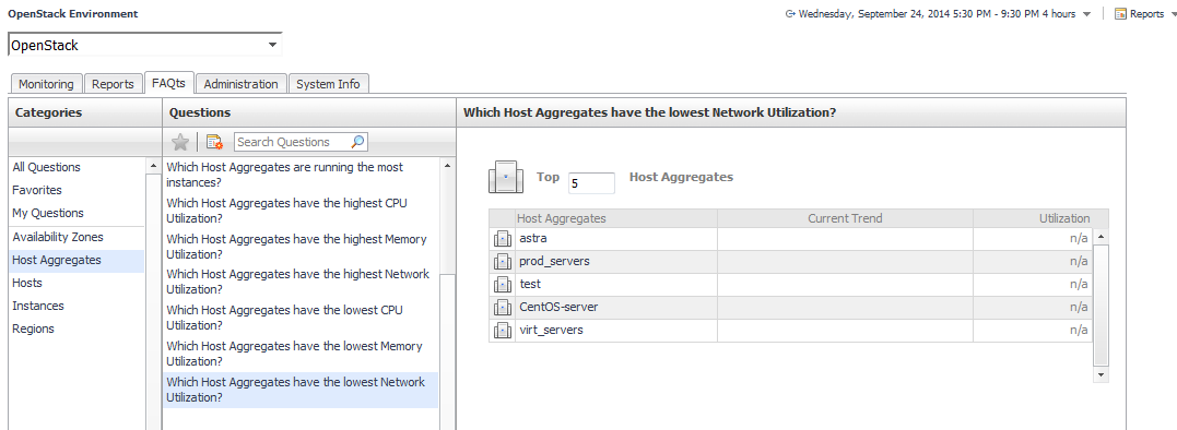This view lists the categories for which questions can be answered for you by Foglight for OpenStack.