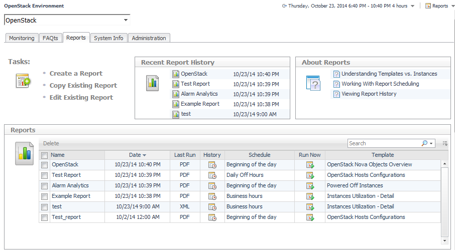 This tab is available in the OpenStack Environment view through a navigation tab. The display provides a convenient and easy-to-use dashboard with which to create reports, keep a track of past reports, reuse reports and edit reports.