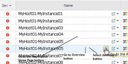 Upon the configuration as a distributor for monitored instances. Instances detected as distributors appear with the button Go to the Replication Home Page () next to the button Go to the Home Page on the Name column of the Databases table.