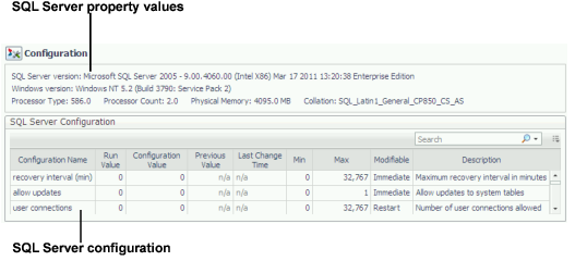 The Server Property Values panel contains information about the server properties of the monitored SQL Server instance.