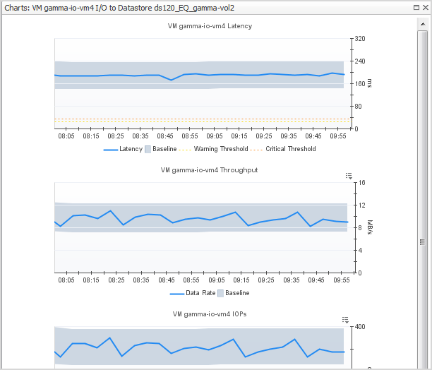 A virtual machine may be connected to multiple datastores and RDM disk extents, each of which may report varying degrees of problems. When a virtual machine has more than one datastore/RDM view, start by scanning the timeline bars in the VM I/O to Datastore/RDM panel to identify a datastore/RDM with consistently slow I/O performance or significant changes from typical performance.