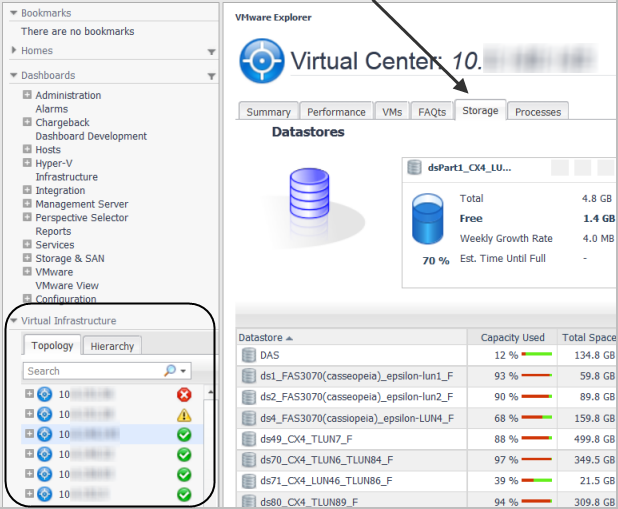 On the navigation panel, under Dashboards, click either VMware > VMware Explorer or Hyper-V > Hyper-V Explorer.