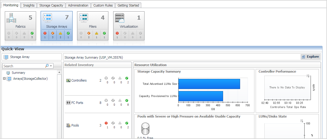 Pool capacity is evaluated every few hours (after a new topology collection) to determine if a low pool capacity alarm should be generated, and to summarize the number of pools experiencing capacity pressure on the Environment Summary/Monitoring/Summary for Arrays and Filers.