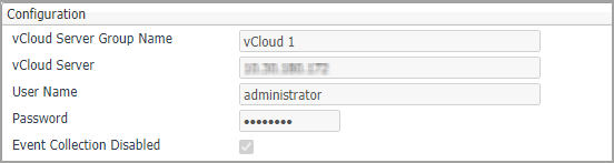 The Configuration properties specify general settings the vCloud Director Agent needs to connect to the monitored vCloud server.
