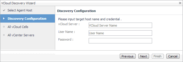 On the Discovery Configuration page, provide the following information needed to connect to the vCloud server belonging to the group whose cell you want to monitor.