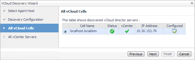On the All vCloud Cells page, select the vCloud server that you want to monitor, and click Next.
