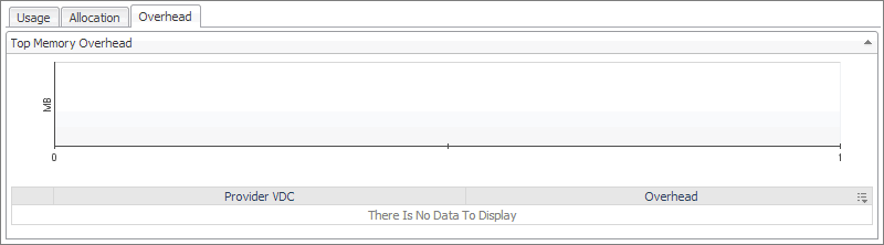 Use this tab to identify the organizations, organization vDCs, or provider vDCs with the highest amounts of memory overhead. The information appearing on this tab can help you to quickly identify the objects that may require additional memory resources in order to avoid potential bottlenecks.