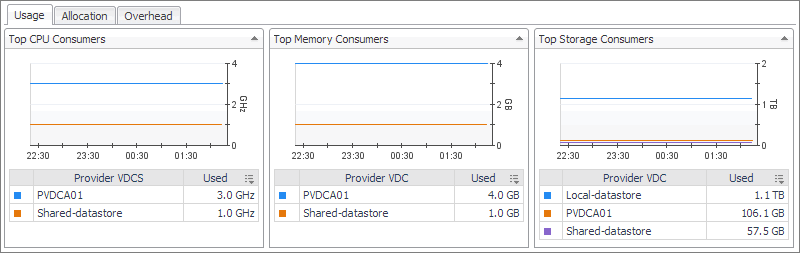 Use this tab to identify the organizations, organization vDCs, or provider vDCs with the highest usage of CPU, memory, and disk resources. The information appearing on this tab can help you to quickly identify the objects whose usage exceeds projected expectations. In most cases, allocating additional resources to these components can help avoid potential bottlenecks.