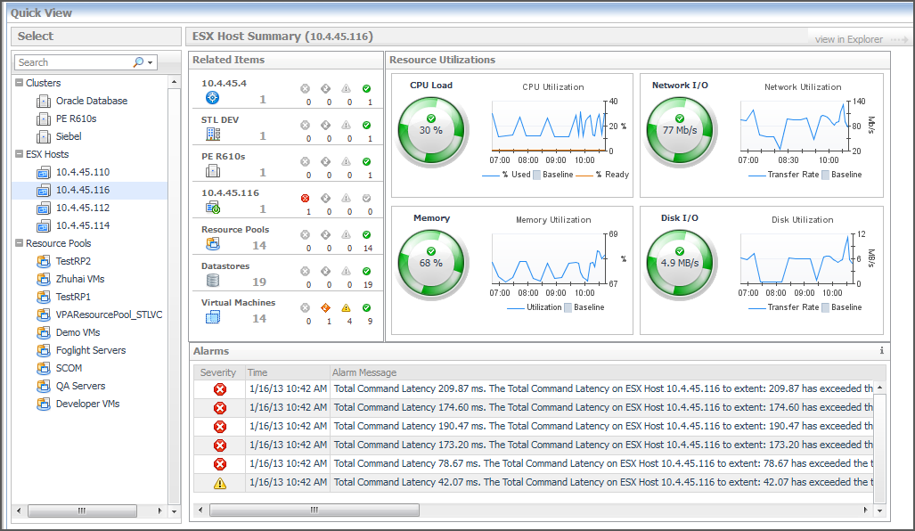 The Quick View appears in the middle of the VMware View Environment dashboard. For more information about this dashboard, see Use the VMware View Environment dashboard.