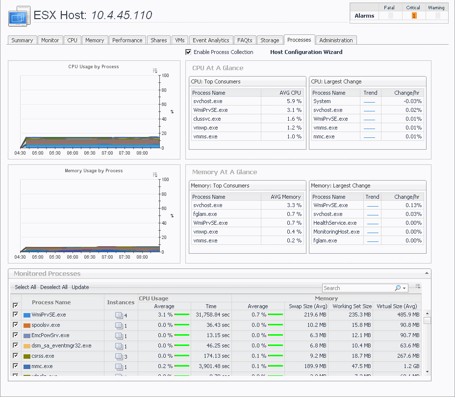 This tab only appears when you are exploring individual Virtual Centers, ESX hosts, and virtual machines, and have the Cartridge for Guest Processes Investigation installed and active. It displays an organized view of process information gathered by the Cartridge for Guest Process Investigation from the virtual or physical machine configured to send process information. When you open this tab, the process information for the selected server or virtual machine appears, allowing you to view the current CPU, memory, and monitored process statistics.