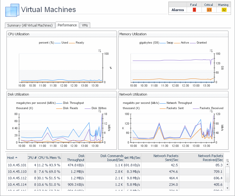 This tab is available in the VMware Explorer. To find it, open the VMware Explorer and on the Virtual Infrastructure view, that appears on the navigation panel, select a Virtual Center, datacenter, cluster, ESX® host, resource pool, or one of the following containers: Datacenters, ESX Hosts, Resource Pools, or Virtual Machines. In the VMware Explorer, open the Performance tab.