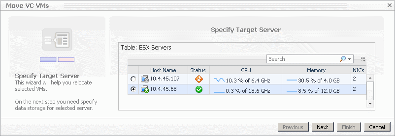 The Move VC VMs dialog box appears with the Specify Target Server page open.