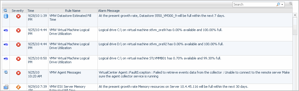 Object indicator. Indicates if the alarm is related to a virtual center , datacenter , cluster , ESX host , resource pool , virtual machine , datastore , agent , or logical drive .