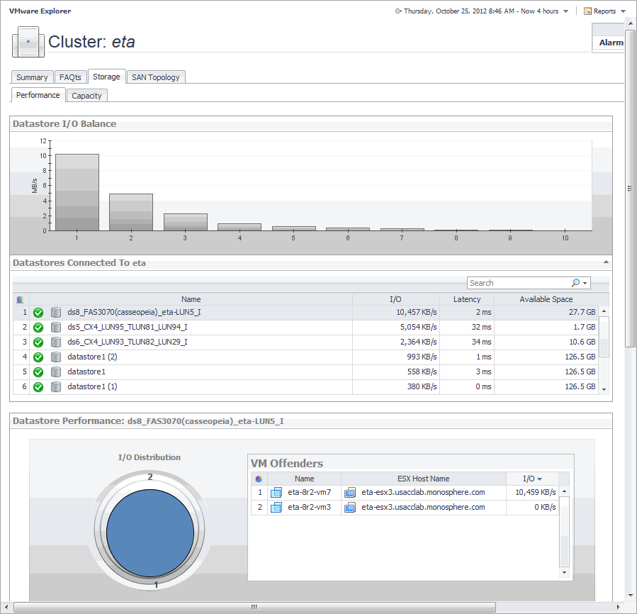 This view lists the datastores connected to the selected cluster and shows performance metrics associated with each datastore.