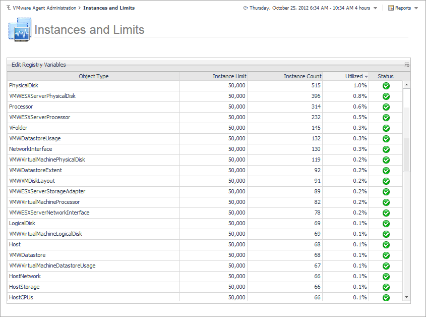 Explore the Instances and Limits view to see the existing VMware object types. To access this view, on the VMware Agent Administration dashboard, click Review Instances and Limits.