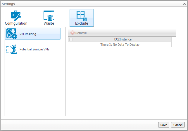 Exclude. After selecting an instances either in the VM Resizing or Potential Zombie VMs instance table, click Exclude to remove the selected instances from calculation.