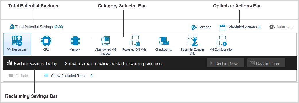The Category Selector bar allows you to select VM components for optimization: