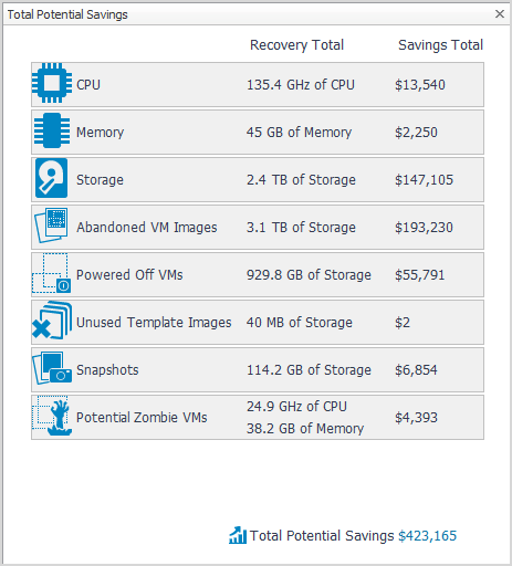 Click Total Potential Savings to open the Total Potential Savings dialog box, which lays out the total potential savings by VM component.