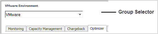 The Optimizer provides a broad platform of categories to optimize your virtual environment. You begin this process by using the Group Selector, located in the upper left section of the VMware Environment dashboard, to select the required VM object.