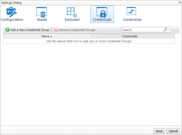 The Credentials tab allows you to add, edit, and remove credentials groups. This tab is only for the Storage rightsizer.