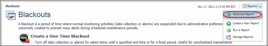 To create one-time blackouts, click Create a One-Time Blackout on the Blackouts page. To create scheduled blackouts, click Create a Scheduled Blackout.