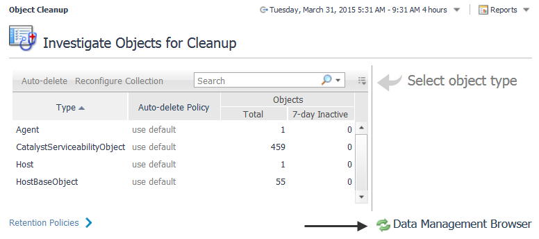 The following walkthrough demonstrates how to locate and manage stale types based on the default settings provided. In this example, we are using Catalyst Serviceability Object as the type with too many objects.