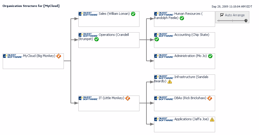This example walks you through an exercise that extends Foglight to represent a company’s Org structure. We create the model, load it into the server, populate it using a Groovy script, and create some dashboards to visualize the result: